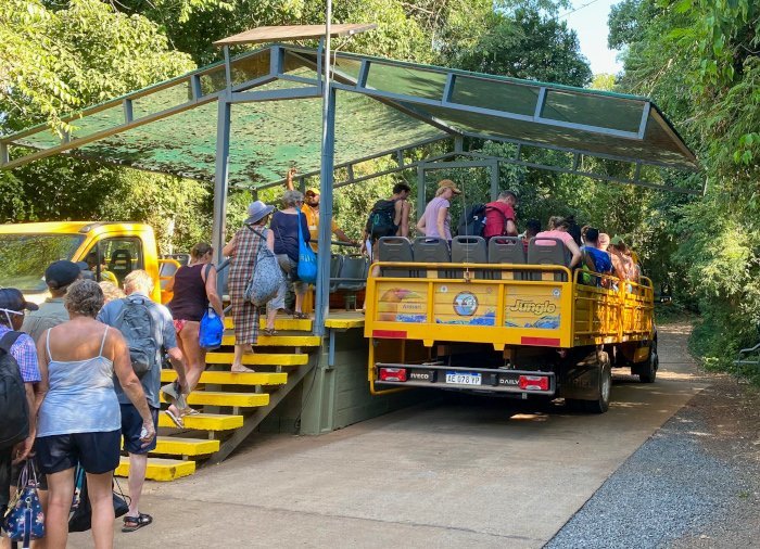 The first part of the trip is by 4WD bus through the jungle along a 5 km gravel road down to the harbour. From here, a steep staircase leads down to the harbour, where a speedboat is waiting to take you up the river to the roaring waterfalls.
