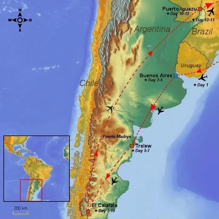 Please note that the domestic flight from Trelew to El Calafate often flies via Buenos Aires. Be prepared for a very early morning departure from Trelew.