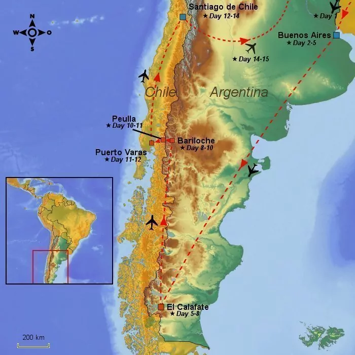 The tour heads from here to the indescribable beauty of Patagonia with a visit to Los Glaciares National Park, home to mighty glaciers, including Perito Moreno. From the barren, windswept landscape, the tour continues to idyllic Bariloche, which is surrounded by deep blue lakes and snow-capped mountains in the lush lake district.