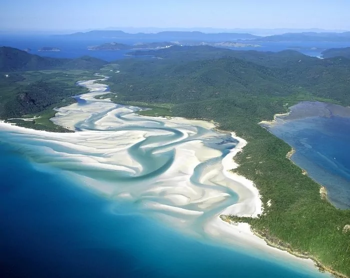 In the Coral Sea off the coast of Queensland, right in the middle of the Great Barrier Reef, you’ll find 74 picturesque tropical islands collectively known as the Whitsundays. Most of these islands are uninhabited and their natural surroundings are well-preserved.