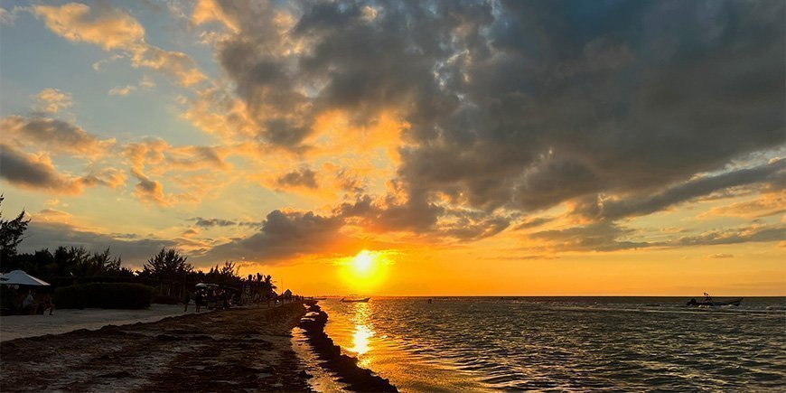 The tropical island of Isla Holbox, surrounded by crystal-clear water, white beaches, and swaying palm trees, is at its most beautiful at sunset when the sky becomes a canvas of colours. The natural phenomenon of bioluminescence causes microorganisms to sparkle like small lights in the water, making the sight even more magical – especially during the new moon.