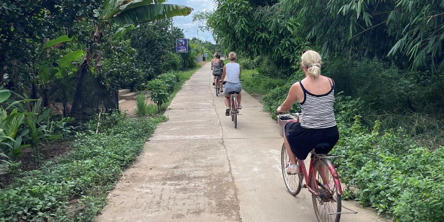 During the cycling tour, we stop along the way to plant trees and try the local pomelo fruit. We visit the local food market in Kratie and the boat trip which was also very special. The boat trip along the Mekong River to see the rare Mekong dolphins is just magical. For us, Kratie was absolutely a highlight of the trip.