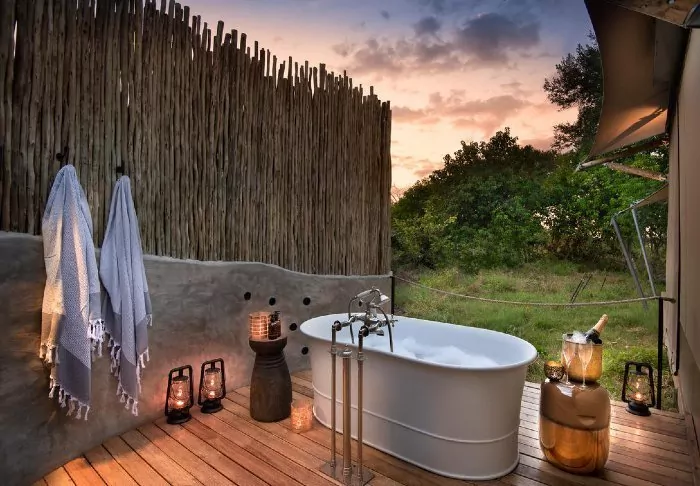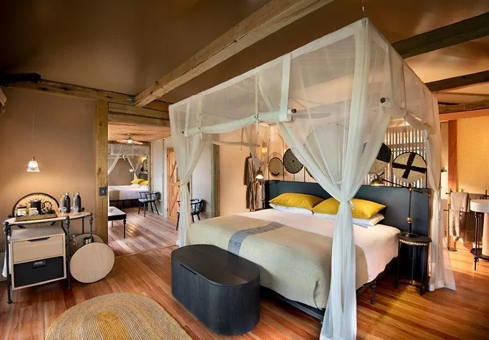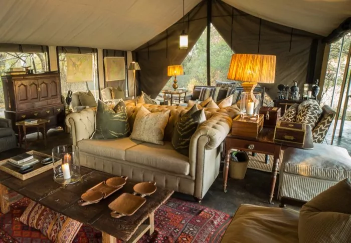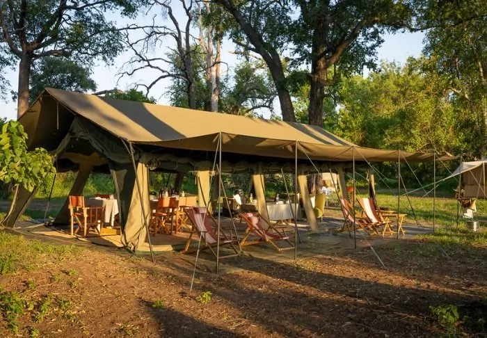 Awaiting you at the two camps, which are located close to each other, but still function completely independently of each other, are a total of 14 fabulous tents, which ARE all classic safari tents, but with (solar) electricity, an en suite bathroom and a private outdoor shower with hot water. From your tent, you have a view of the river or the open savannah, where you may be lucky enough to see the animals pass by during the day. Meals are enjoyed in the cosy mess tent or under the open sky, and at night, you will almost certainly be woken up by animal sounds permeating the canvas walls of your tent.