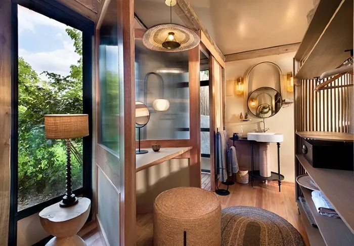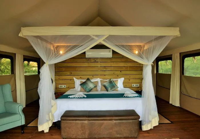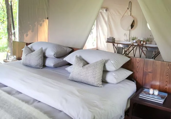 The 16 tents all have an en suite bathroom with a free-standing bathtub, air conditioning, tea/coffee making facilities and a private balcony. The tents are erected on platforms that stand on stilts, which allow the air to circulate under the tents. All the tents are the same inside – the difference lies in whether you want a river view or a view of the garden.