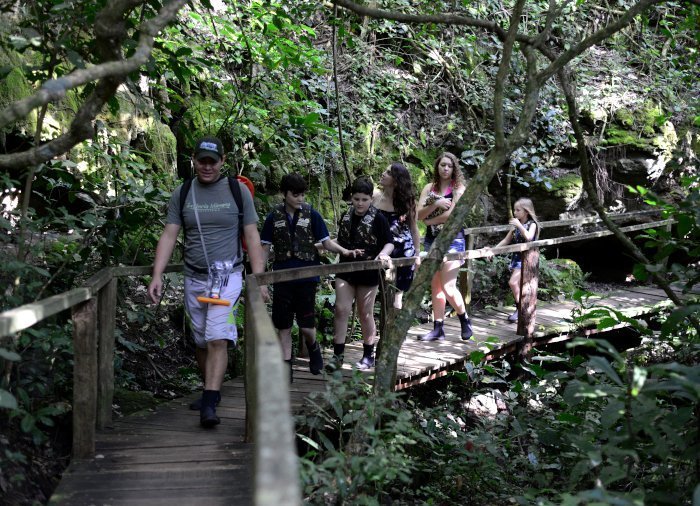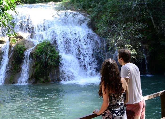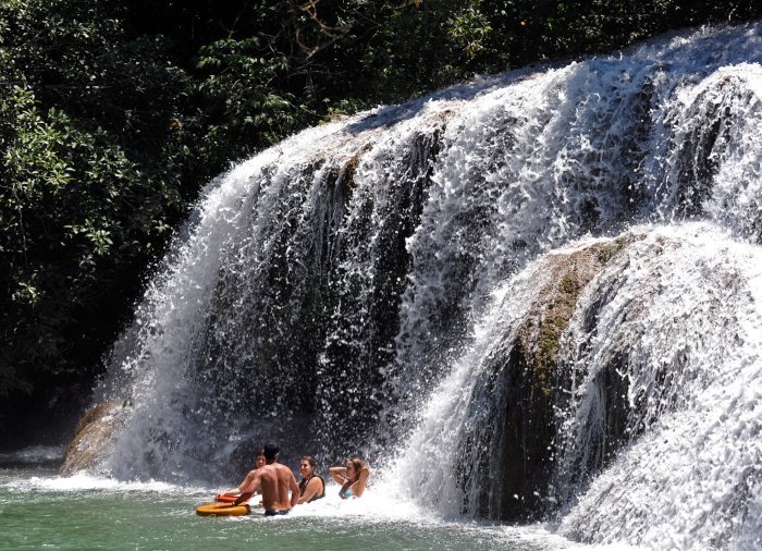 before taking you on a guided walk through the lush woodland around the Rio Mimoso River, passing 9 waterfalls of various shapes and sizes. Along the way, you can swim under the waterfalls and in natural pools, explore small caves and look out over the Serra da Bodoquena with its waterfalls and mountains that form the valley around the Mimoso River. If you feel daring, you can jump from a 6-metre-high bridge into a natural water hole. On some stretches, you can also go on a short boat ride and relax while enjoying the surroundings.