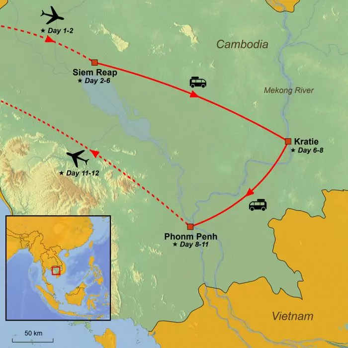 Experience the unique attraction of Angkor Wat, lush landscapes along the Mekong River, rare Mekong dolphins at Kratie and the lively capital of Phnom Penh. Extend the tour with a beach holiday.