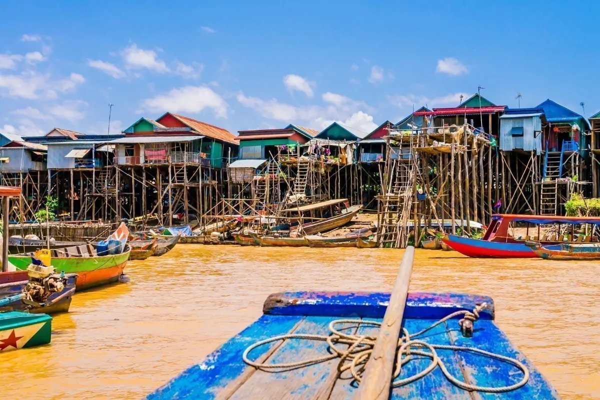 You arrive on the shore of Tonle Sap Lake and board a boat that will take you to the floating village of Kompong Phluk. Here, you get right up close to what life is like for the many families who primarily live off fishing. The families live along the banks of the lake in colourful houses that stand on long stilts, allowing them to cope with the high water level in the rainy season, when the narrow streets in the village turn into small canals. In the dry season, when the water level is low, the tall stilts are in full view.