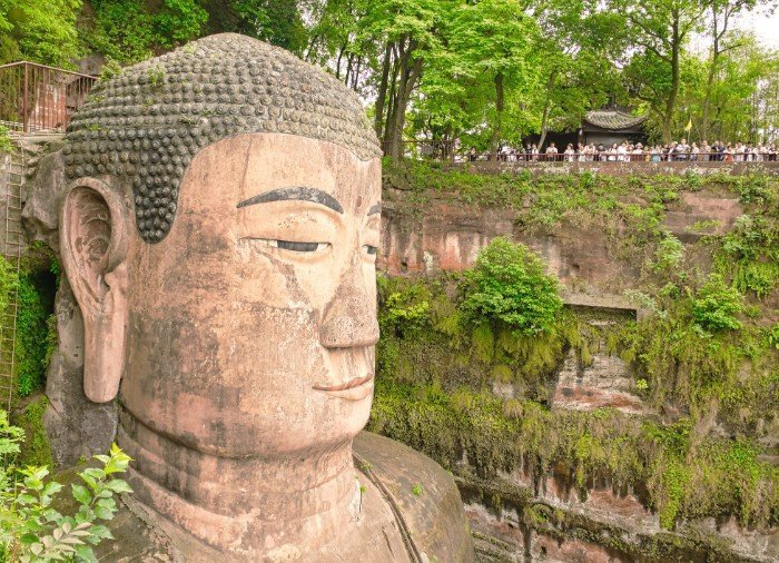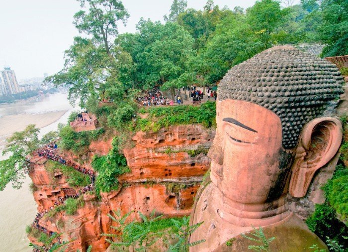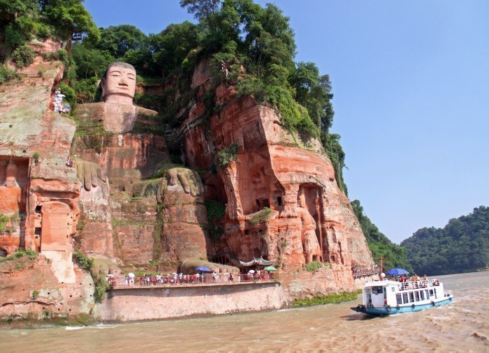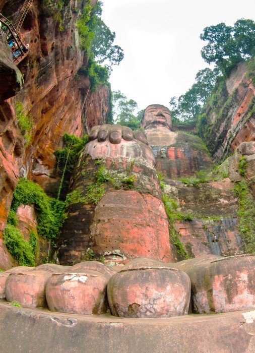 The Giant Buddha is carved into a red sandstone cliff where the Dadu, Minjiang and Qingyi rivers meet. According to Chinese legend, many ships disappeared without trace in the whirlpools at the confluence of the rivers, as the waters here were very turbulent. A monk named Hai Tong therefore proposed the building of a giant sitting Buddha to watch over the ships and placate the evil river gods. For years, he asked for funds to begin the project, which was started during the Tang dynasty in 713. Unfortunately, the monk died when the project was half finished. After his death, the project therefore came to a halt due to lack of funding. It was not until 70 years later that local governor Wei Gao decided to sponsor the project, and the statue was completed in 803.