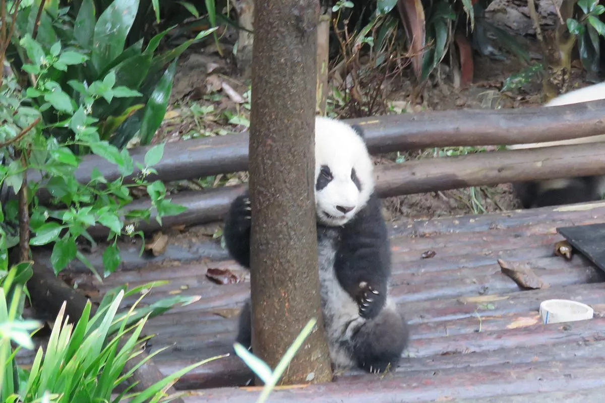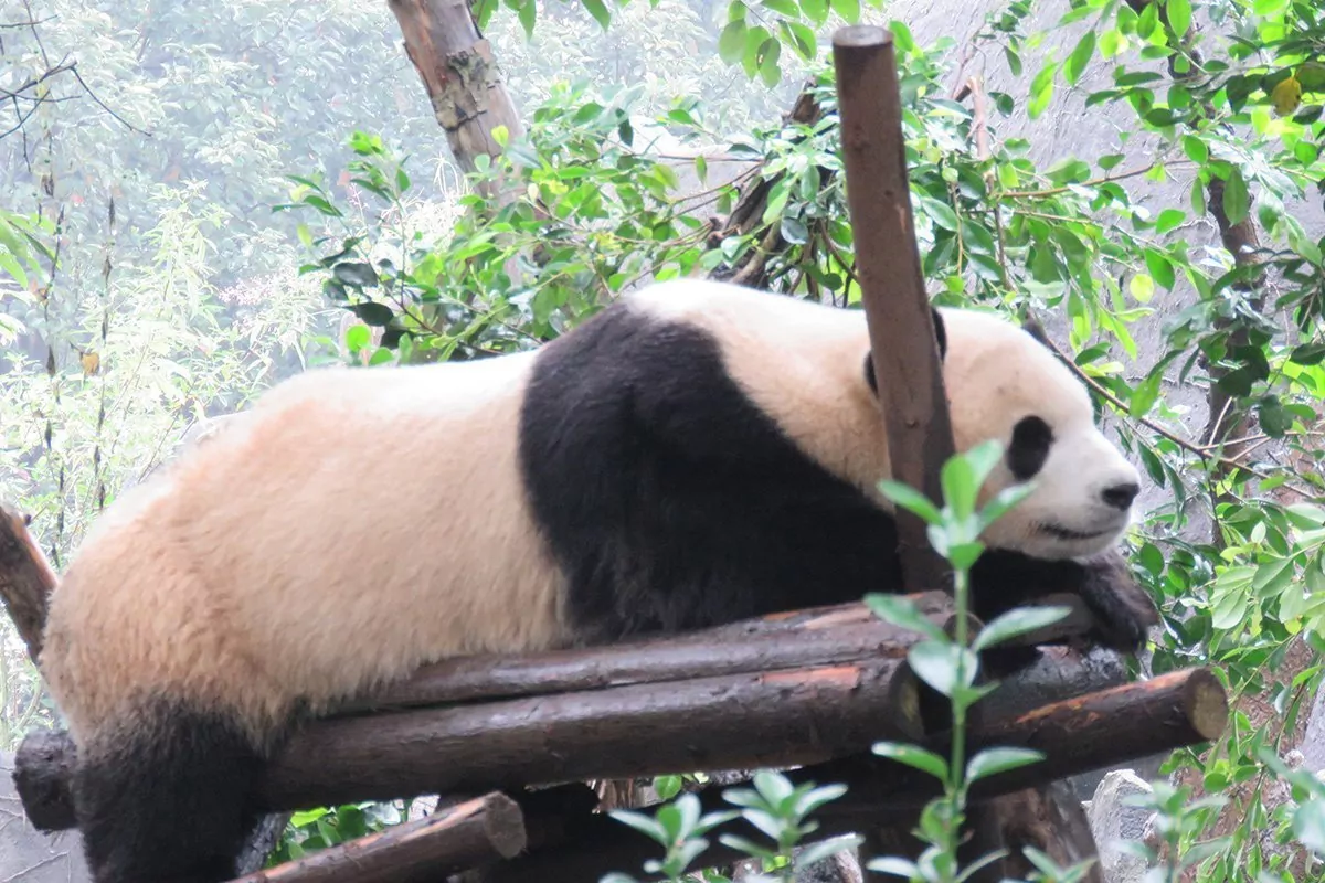 The panda spends up to 15 hours a day eating. There is not a lot of nutrition in bamboo, so an adult panda needs to eat between 15 and 20 kg a day to survive. That is why the adult pandas seem lazier than the others, just lying around sleeping or eating, while the younger pandas spend more time playing and teasing each other.