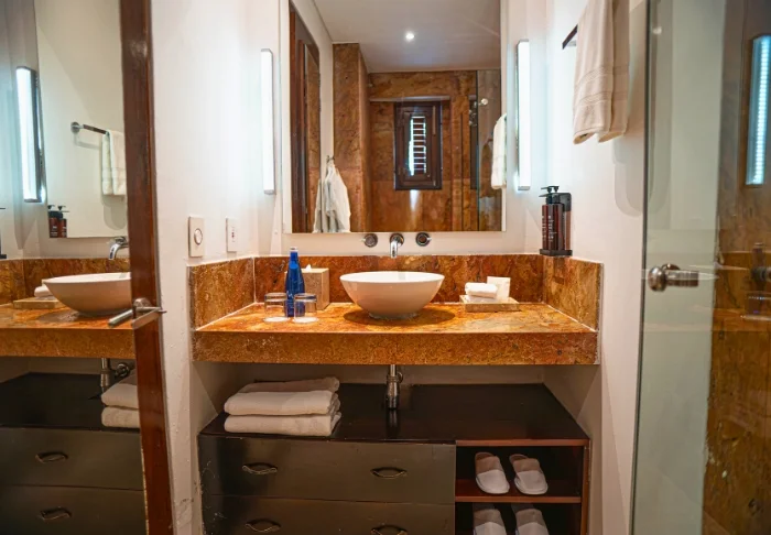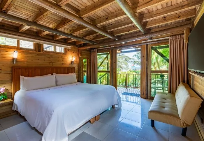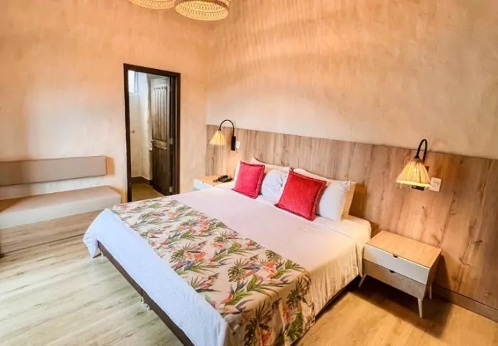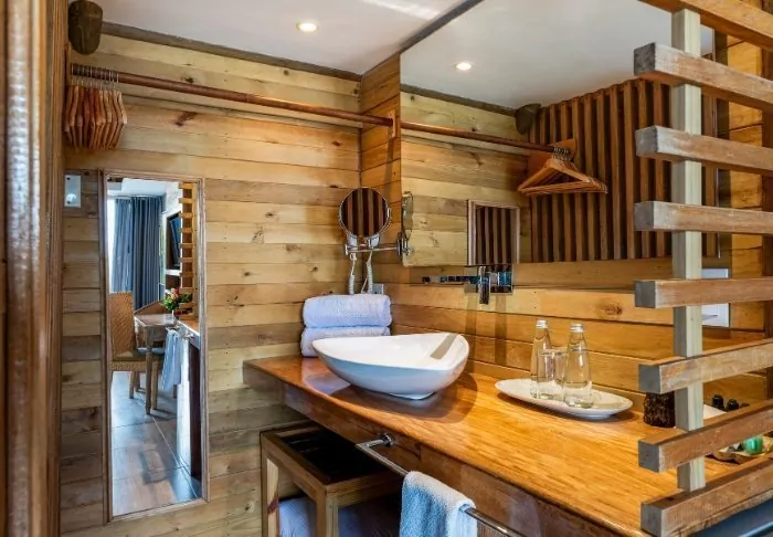 With just 42 rooms, the hotel guarantees a cosy and intimate stay. Each room is constructed with wood and bamboo, perfectly complementing the natural environment. The rooms are equipped with air conditioning, Wi-Fi, satellite TV, a minibar/fridge, a safety box, and a private bathroom with toiletries.