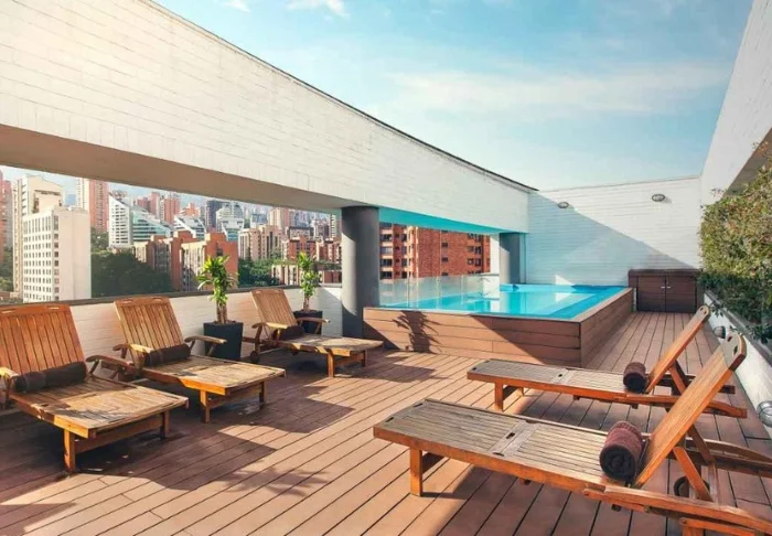 On the hotel’s rooftop terrace, you can relax in the jacuzzi or soak up the sun while taking in the stunning views of the Medellín skyline.
