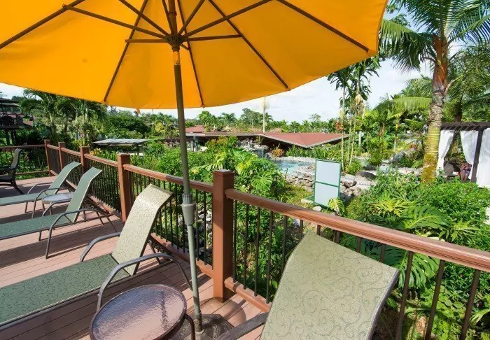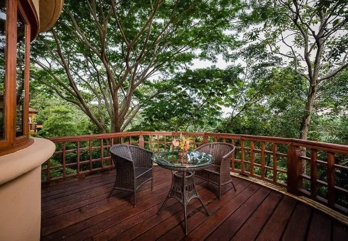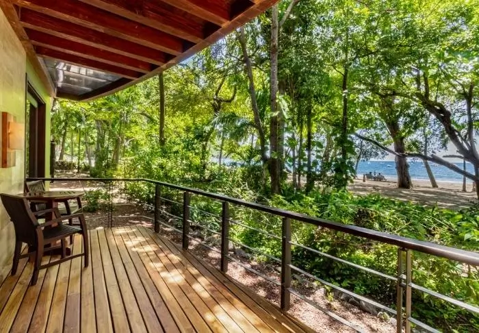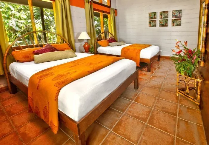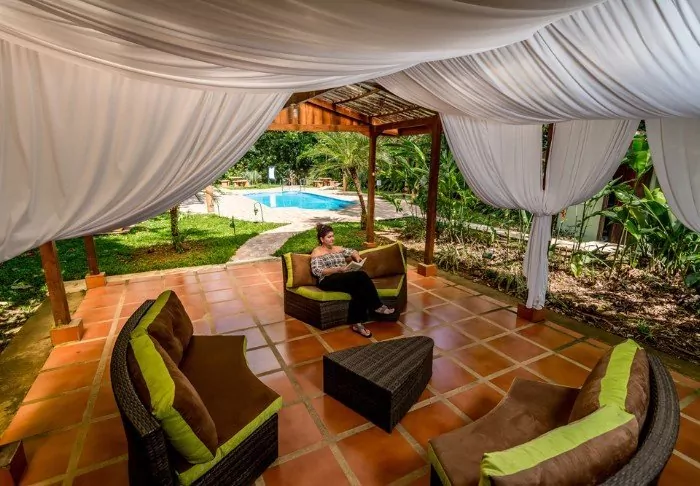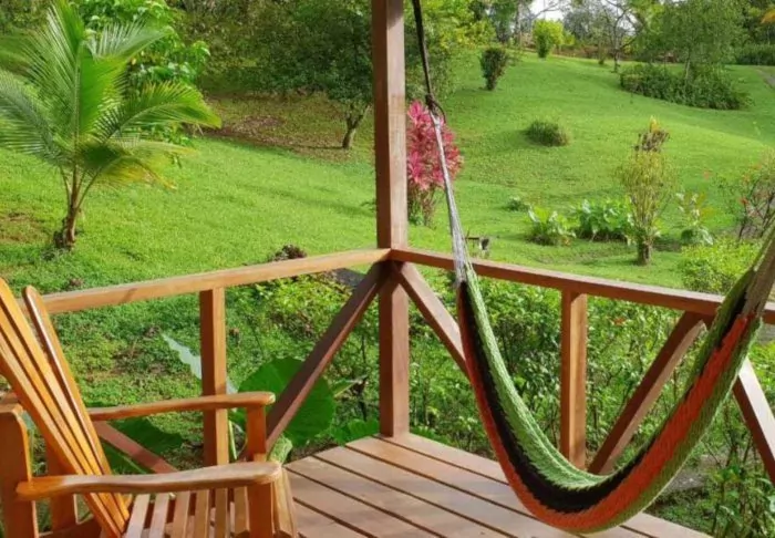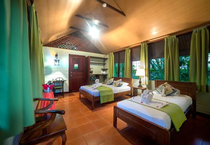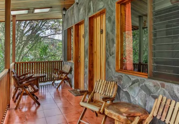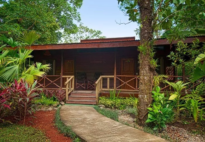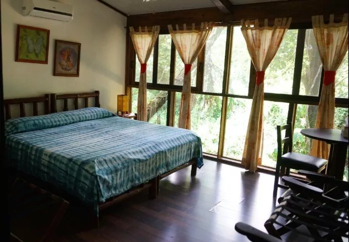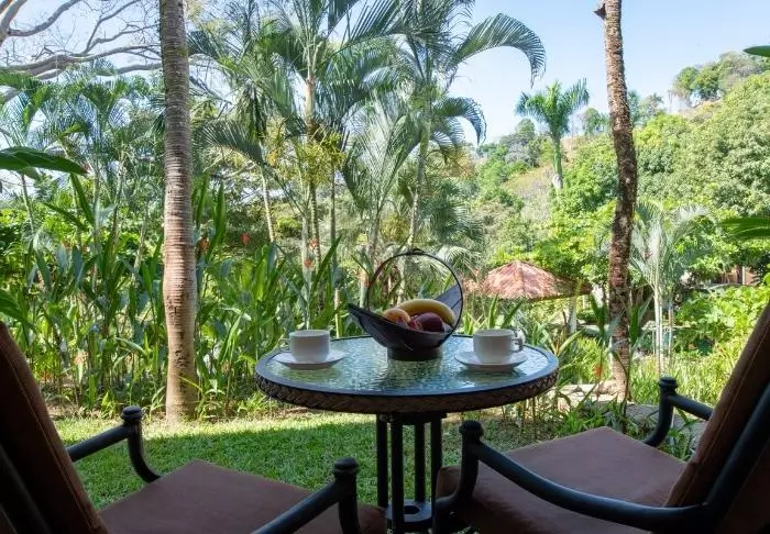 Its rooms are primarily made of wood and decorated in natural colours with green hues. All rooms have air conditioning, cable TV and a mini fridge as well as an en suite bathroom with a hair dryer. Each room also has its own small covered veranda with a couple of chairs where you can relax and enjoy the lush surroundings – and perhaps even spot a colourful butterfly or a hummingbird.
