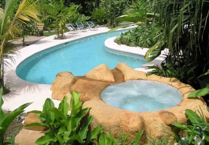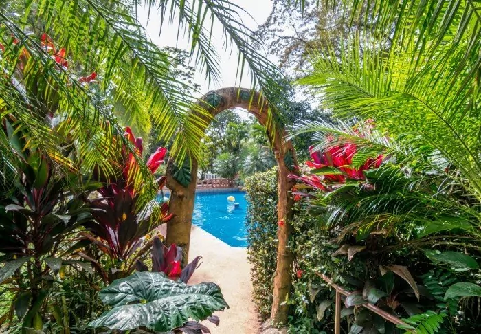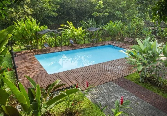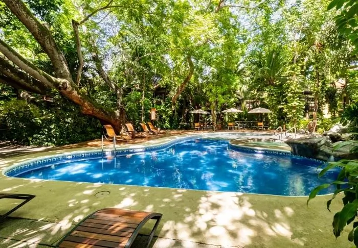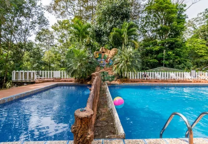 The hotel has a delightful pool area with recliners, perfect for relaxing, enjoying the verdant surroundings and listening to the varied noises of the forest.