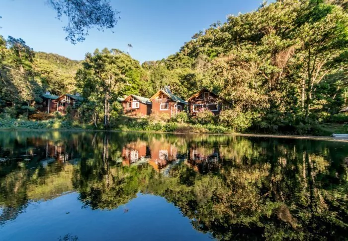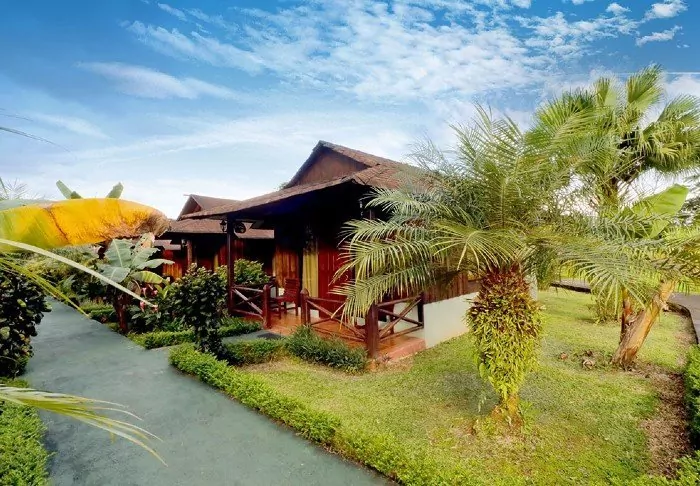 The lodge’s 10 bungalows are built of wood and decorated in warm colours with attractive wood panelling on the walls. With two double beds, they can accommodate up to 4 people. They also offer Wi-Fi, cable TV, a fridge, an en suite bathroom with toiletries and a hair dryer, and a small seating area where you can sit and relax. Each bungalow also has a veranda where you can sit and enjoy the lush surroundings.