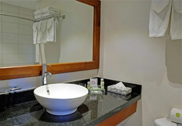 The hotel consists of thatched bungalows in earthy colours, housing 63 spacious rooms. All rooms have comfortable beds, a sofa, a desk, a minibar and fridge, a safe, air conditioning, a flat screen TV, a telephone, a coffee maker and an en suite bathroom with hair dryer. There is also a balcony or terrace for each room, where you can sit and relax while enjoying the scenic surroundings.