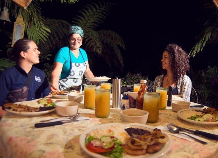 After your little “evening safari”, the tour rounds off with a traditional al fresco Costa Rican dinner. The food is enjoyed with a beautiful view of the lights from the towns in the San Carlos area.