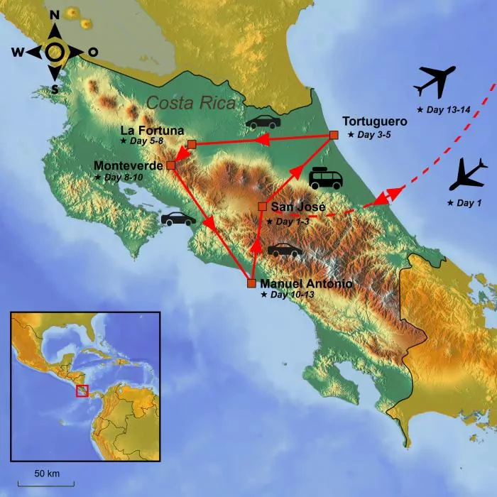 The time has come to say goodbye to Costa Rica. You drive to San José and drop the car off near the airport. From here, a shuttle bus takes you the last stretch of the way to the airport before you fly back home with connecting flight(s) along the way.