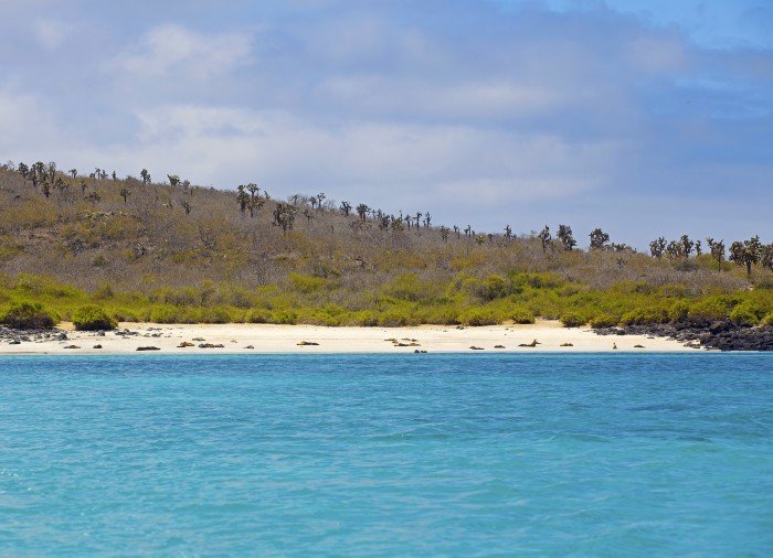 Santa Fé is located south-east of Santa Cruz, and from Puerto Ayora, you have a 1.5-hour boat ride out to the island, where you will be welcomed by a large sea lion colony on the white sandy beach.