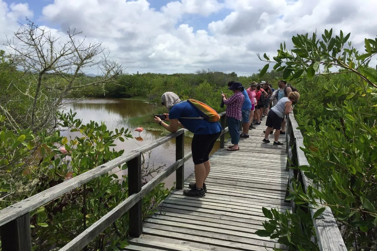 In the afternoon, you’ll embark on an excursion to some of Isabela’s highlights. The tour begins with a visit to the Arnaldo Tupiza Tortoise Breeding Centre, located just outside the town. Here, volunteers work to increase the population of giant tortoises on the island, and you can see hundreds of tortoises of all sizes. Your guide will also take you to a fascinating wetland area, where you might spot birds like stilts, moorhens, and white-cheeked pintails, along with the marvellous flamingos.