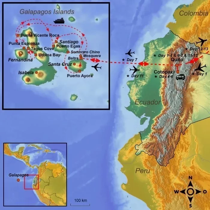 After your visit, you’ll be taken by bus across the island to the Itabaca Channel and sail over to the airport island of Baltra, from where you will fly back to Quito on the mainland of Ecuador. The return flight to Quito often takes a bit longer (about 2.5-4 hours) because there is usually a brief stopover in the city of Guayaquil.