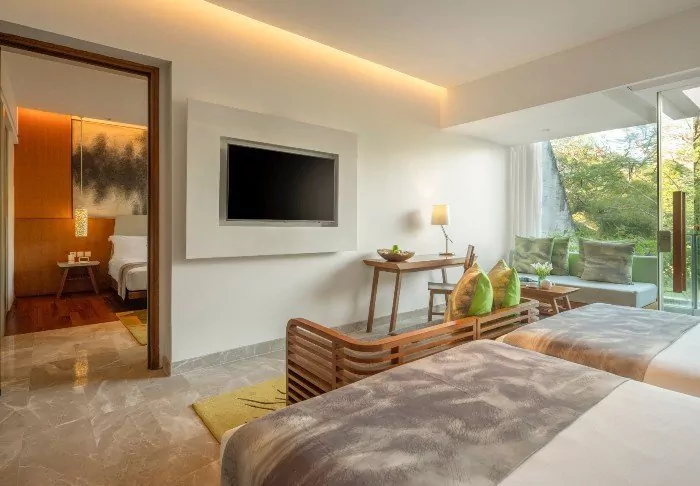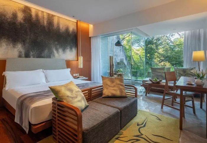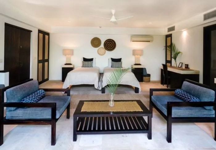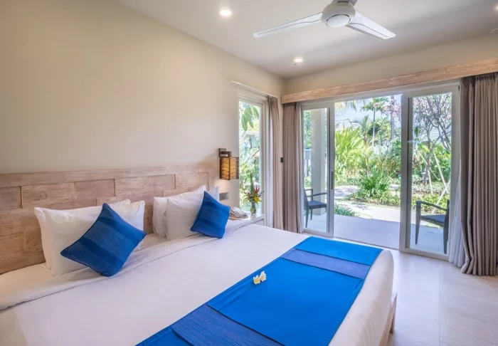You’ll be staying in one of the hotel’s standard deluxe rooms, housed in low-rise buildings scattered across the resort. Each room is 40 m² and features either a king-size bed or two single beds. The design is minimalist, with dark wooden furniture, tiled flooring, and muted tones, creating a calm atmosphere. All rooms offer air conditioning, a TV, Wi-Fi, a minibar, tea and coffee-making facilities, and a safety box. The bathroom includes a shower and hairdryer. From your spacious private balcony or terrace, you can take in views of the resort’s tropical gardens, full of palms and flowering shrubs. Some rooms interconnect, making them a great choice for families travelling together.