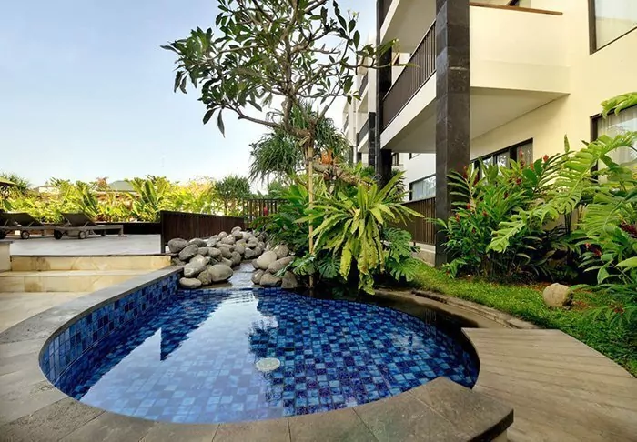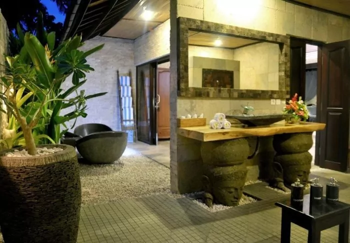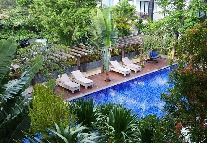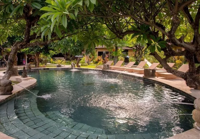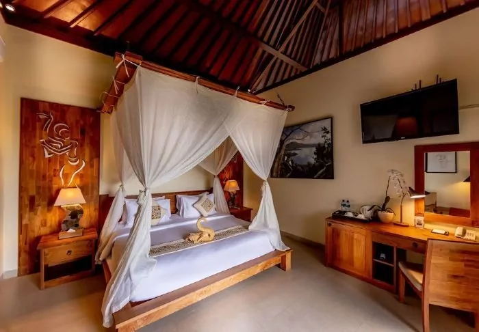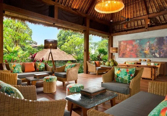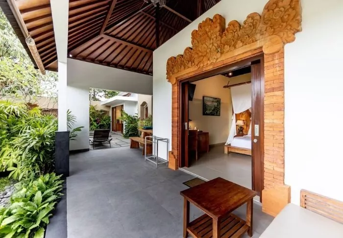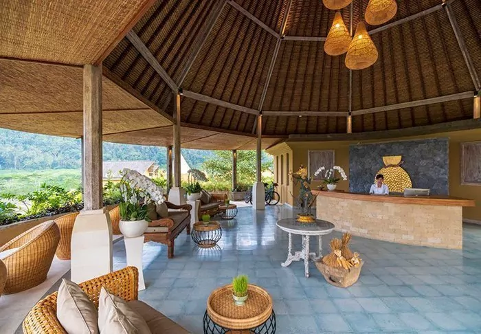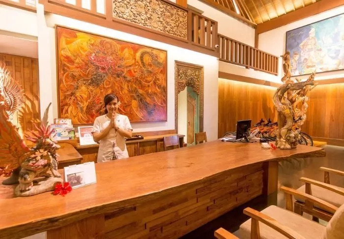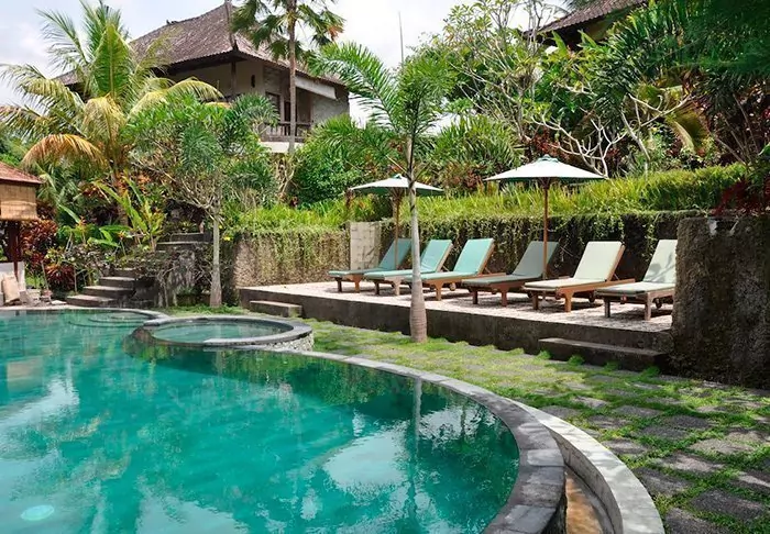 The small hotel is built in traditional Balinese style with natural materials that beautifully complement the green surroundings.