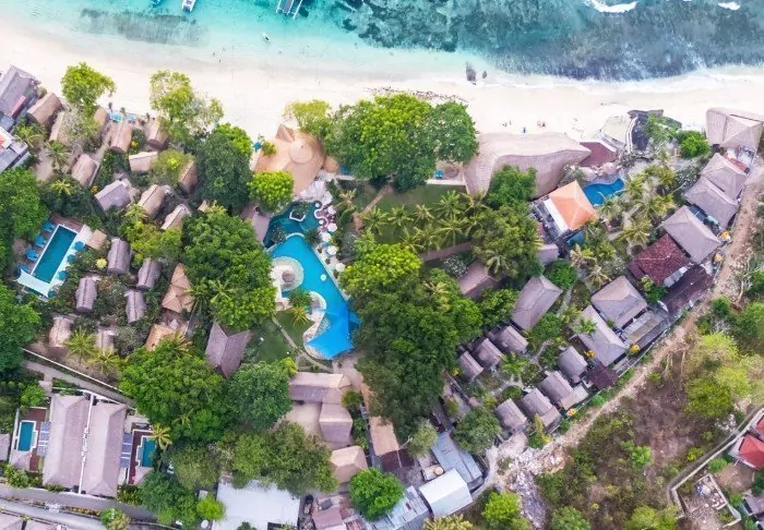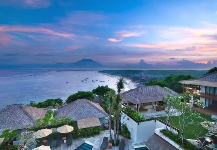 Batu Karang Lembongan Resort is located on a coral slope above Jungut Batu Beach, overlooking Badung Strait and the magnificent volcano Mt. Agung in Bali.
