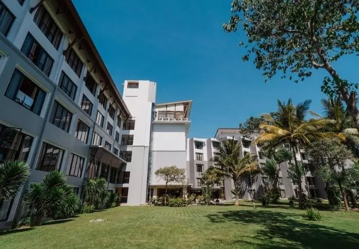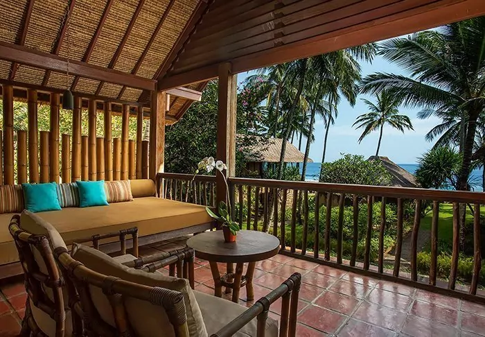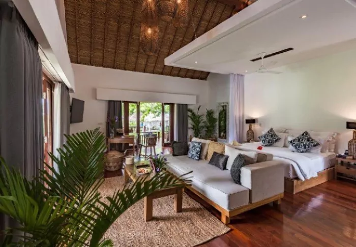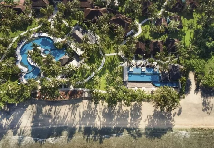 The resort stands out for its elegant and harmonious style, which beautifully complements the scenic surroundings. Surrounded by lush, tropical gardens, the place creates a calming atmosphere with the sound of lapping waves and birdsong, contributing to a charming and relaxing environment.