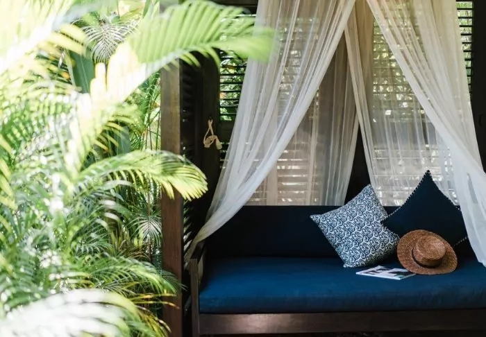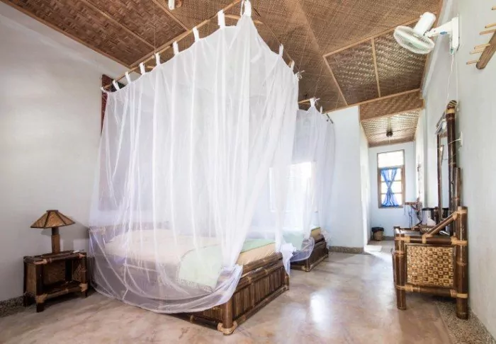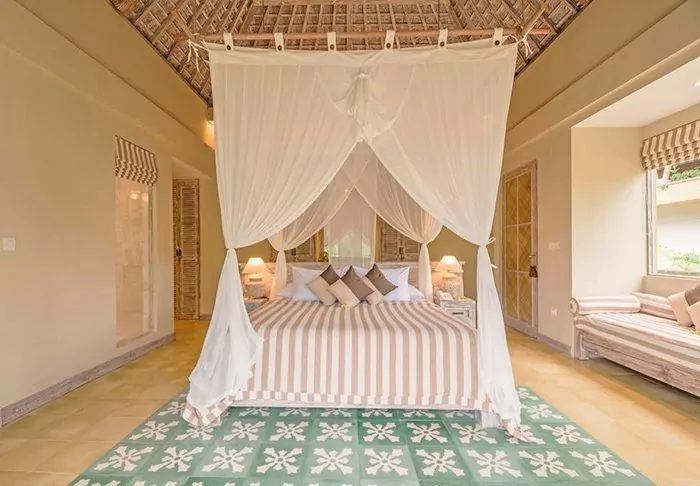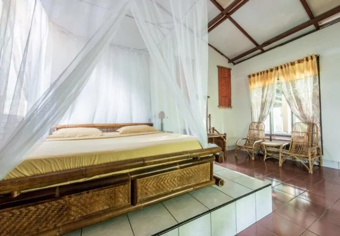 The hotel consists of 18 private bungalows built in a tropical style from natural, sustainable materials. All the bungalows feature elegant canopy beds with mosquito nets as well as Wi-Fi, air conditioning, a mini-bar, tea and coffee facilities as well as a partially open bathroom with a shower, bath robe and hair dryer. On the porch, you can unwind with a good book and enjoy the quiet breeze.