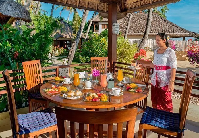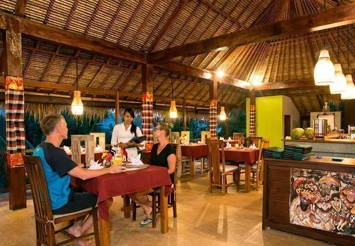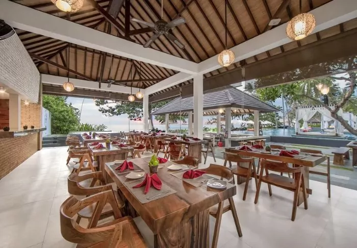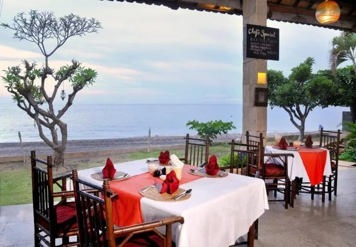 In the restaurant, a team of local chefs and kitchen staff from the nearby village are at the ready to serve Balinese and Indonesian dishes made from local produce and fresh fish provided by the local fishermen. There is also a pleasant sea breeze and a beautiful view of the beach.