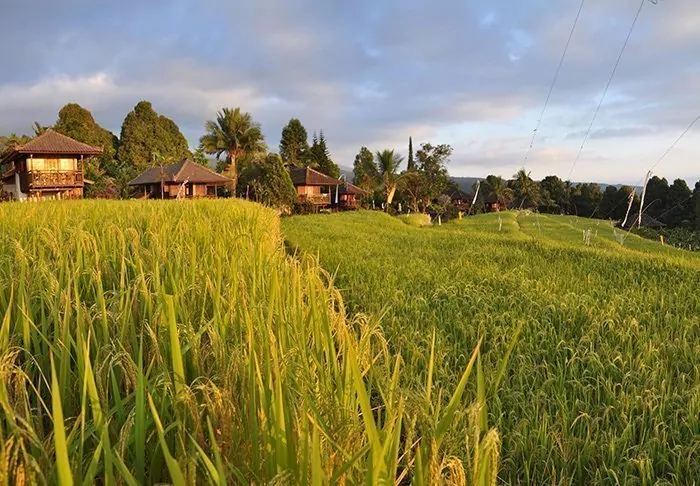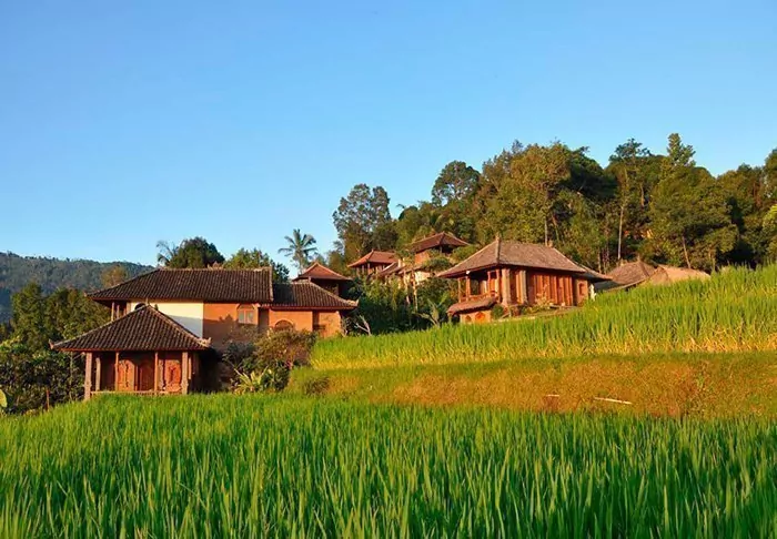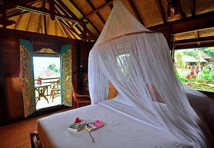 You will stay in charming bungalows known as “lumbung”, which were originally old rice stores. All of the bungalows are decorated in traditional style, with fine, detailed wood carvings. They all have a bedroom with a mosquito net over the bed, a bathroom with either a shower or a bath, and a lovely balcony with breathtaking views of the mountains and rice fields. There is free Wi-Fi, but no air conditioning – it’s not necessary in the temperate highlands.