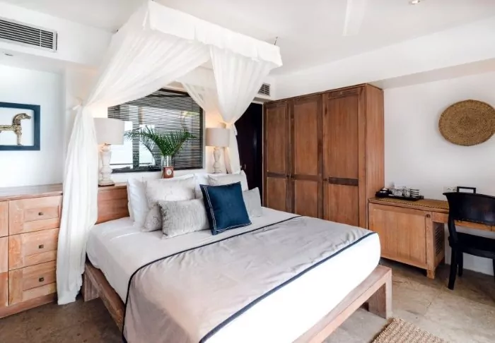 You’ll stay in one of the charming Garden Chalets, set amidst palm trees and tropical plants. The rooms are spacious, decorated in light colours with warm wood details. They are equipped with modern conveniences such as air conditioning, Wi-Fi, a minibar, a safety box, coffee and tea facilities, and a flat-screen TV. Each room also has a private terrace or balcony where you can enjoy your morning coffee at your leisure. The semi-outdoor bathrooms are fitted with a shower and hairdryer, with toiletries also provided. Everything is designed to offer a relaxing environment.