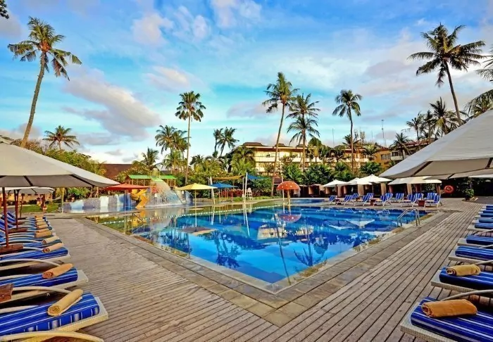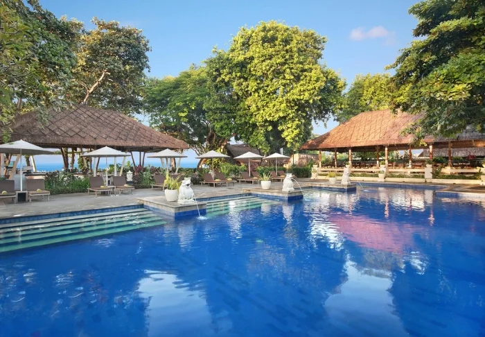 Mercure Bali Sanur Resort is set right on one of Sanur’s finest beaches – a peaceful, wide stretch of sand with shallow waters and the welcome shade of palm trees. The resort is spread out over five hectares of lush tropical gardens filled with swaying palms and meandering pathways weaving between Balinese buildings, topped with traditional alang-alang roofs. You’ll enjoy a tranquil retreat here, while still being just a stroll from Sanur’s lively pedestrian street, lined with cosy cafés, shops, and restaurants.