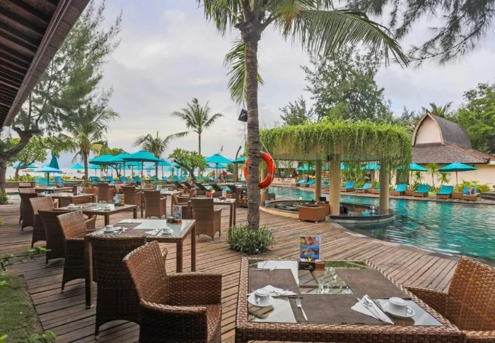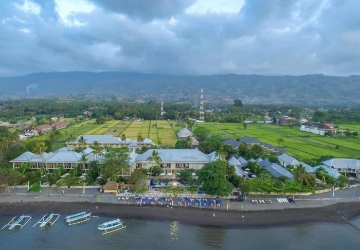 The resort is located right on a lovely beach that invites relaxation. The beach boasts soft, golden sand and calm, clear waters, perfect for a dip or snorkelling. The surrounding palm trees and sea views create a tropical and tranquil atmosphere, where you can enjoy the sun’s rays or find shade under a parasol. The beach is also an ideal spot to witness magical sunsets over the Lombok Strait, painting the sky in warm hues.