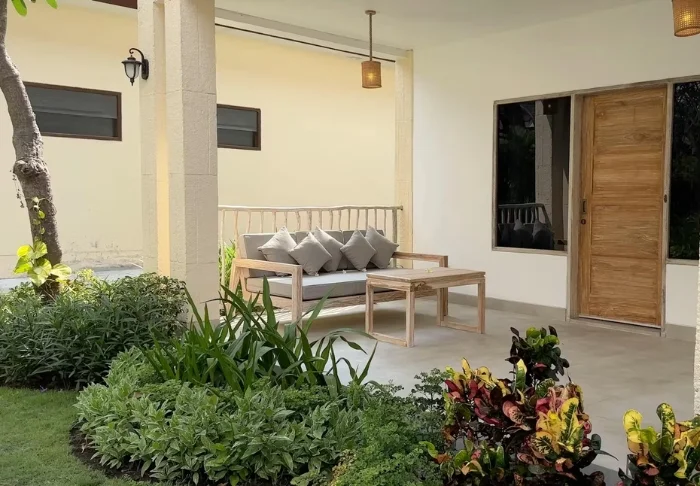 The resort is small and intimate with just 11 rooms in traditional bungalows in a lush garden with tall coconut palms and tropical trees. All rooms are equipped with Wi-Fi, air conditioning, a ceiling fan, a mini bar, a safe, coffee/tea making facilities, a dressing table and a sideboard. The bed is strategically positioned by the large window, allowing you to enjoy the beautiful colours of the sunrise in the sky before you even get up. The rooms have a partially outdoor bathroom with a rain shower and hair dryer. On the terrace, there are sun loungers and a cosy sitting area.