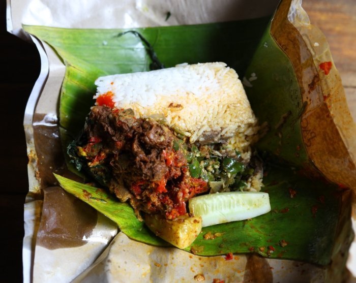 The bicycle ride ends at a small pavilion by the beach, where you can enjoy the dish ‘Nasi Bungkus’, a traditional meal consisting of rice and meat that many locals take with them on the go.