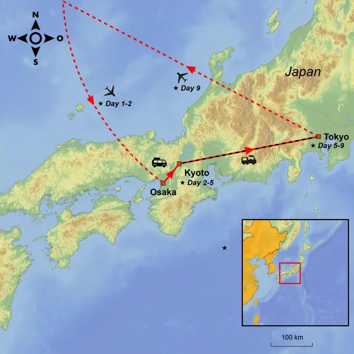 This trip lets you experience the essence of Japan. From the old capital of Kyoto and its history with a deep-rooted culture of respect, neat order and old traditions to the hyper-modern capital of Tokyo with its Imperial Palace, manga culture and the ultra-rich Ginza district. Kyoto’s well-preserved city view with its low, thin-walled wooden houses with sliding doors give you an impression of the Japan of the past, whereas in Tokyo you experience mega-stations, modern architecture and skyscrapers.