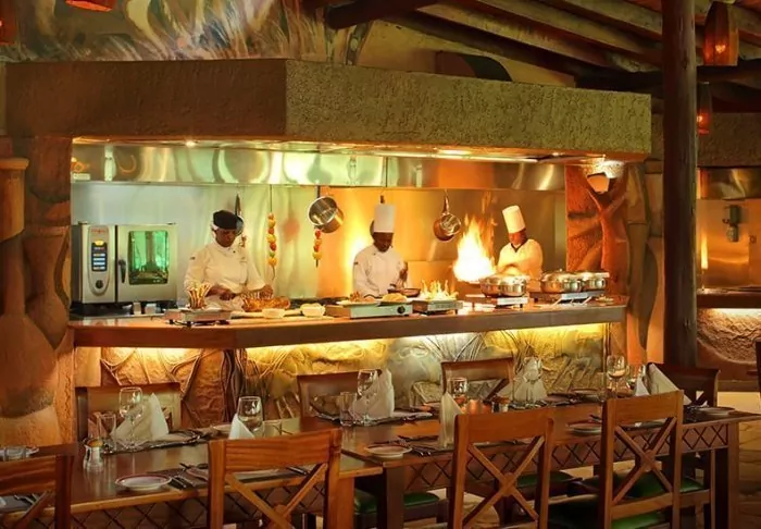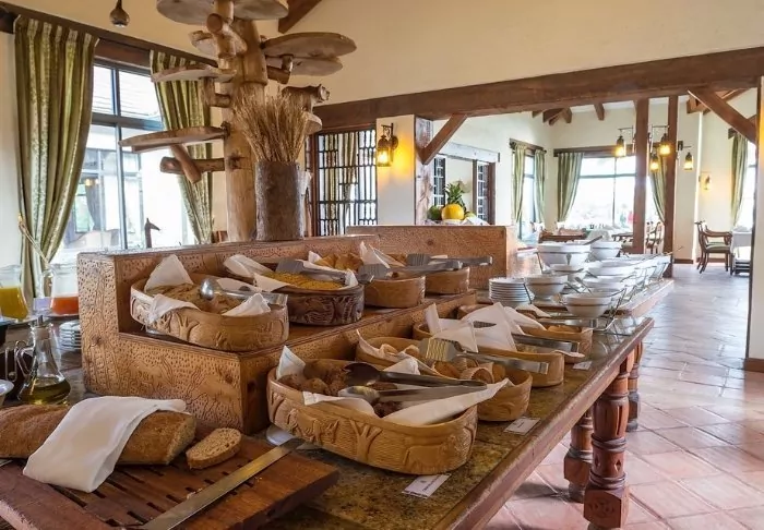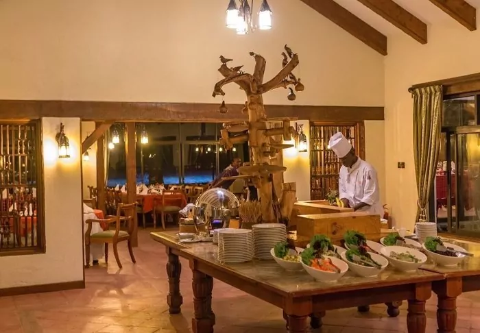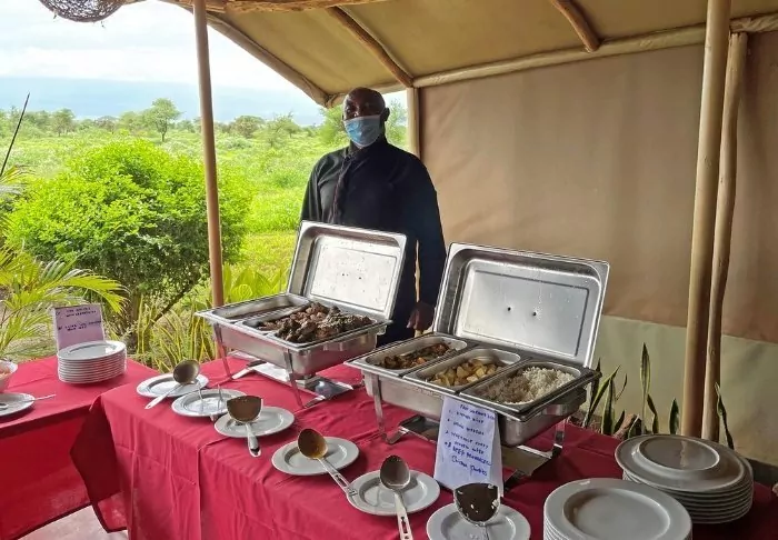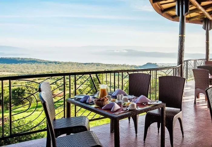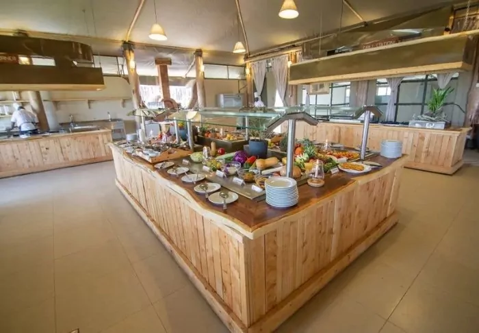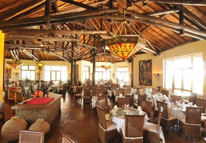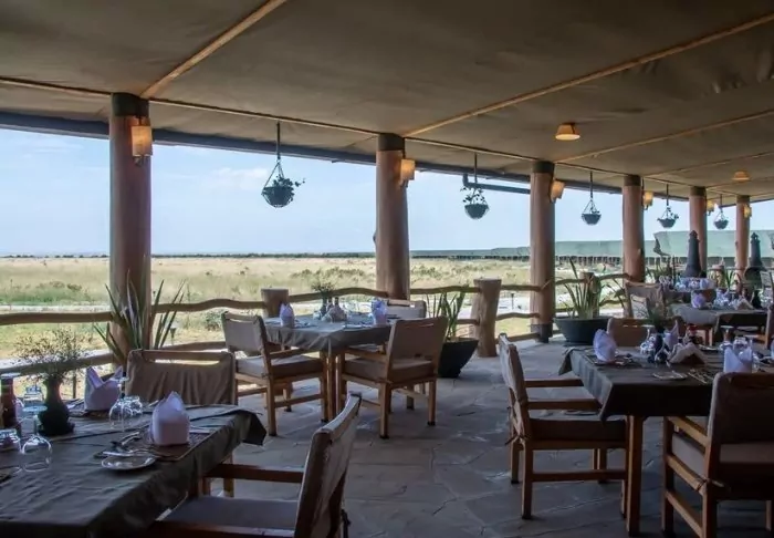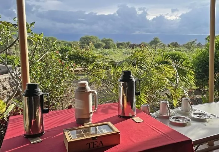 Meals are served in the partially open restaurant overlooking Kilimanjaro.