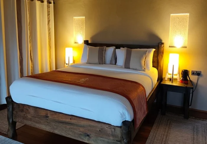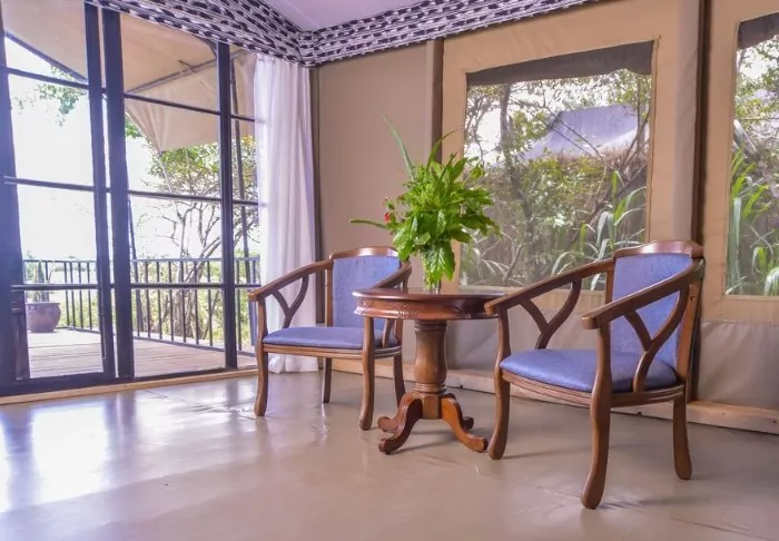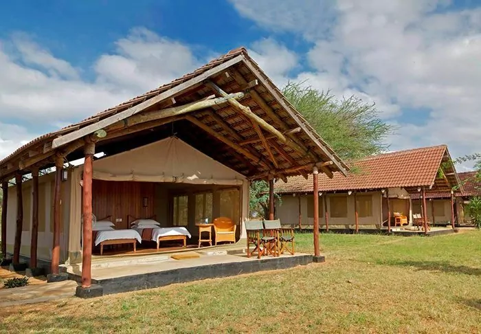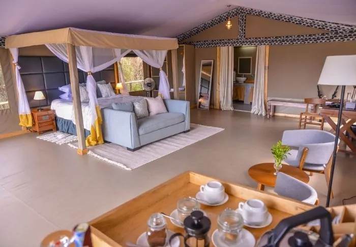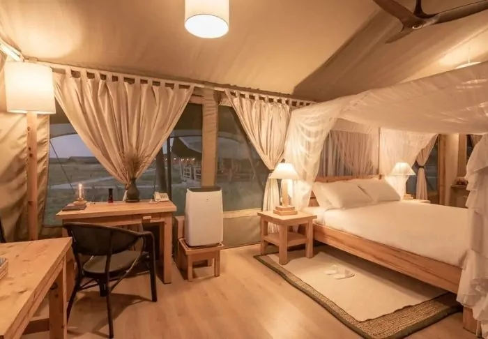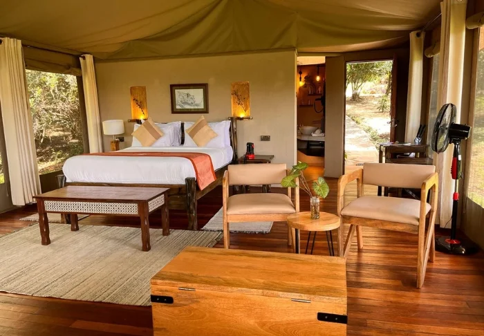 The tents are reasonably sized, each featuring a veranda and a partially built bathroom. All tents are equipped with Wi-Fi and facilities for making tea and coffee.