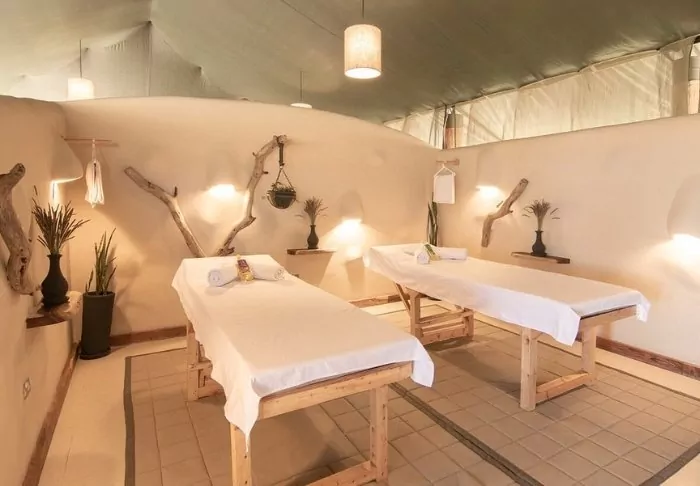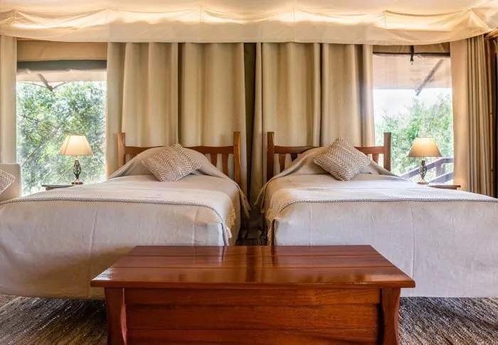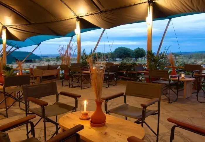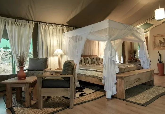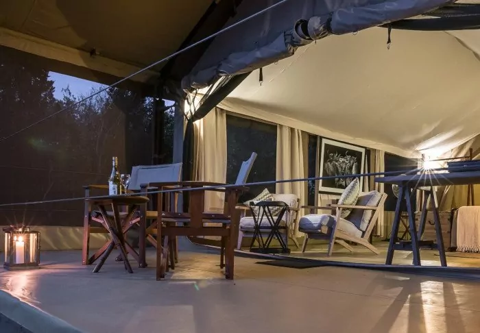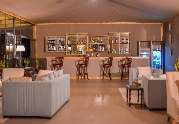 Each tent is equipped with a fan, a drinking water dispenser, and mosquito nets over the beds. There’s plenty of room for your luggage, as well as a cosy reading corner. On the veranda, there’s comfortable seating, ideal for bringing a glass of wine from the bar and enjoying the sunset over the African savannah from there.