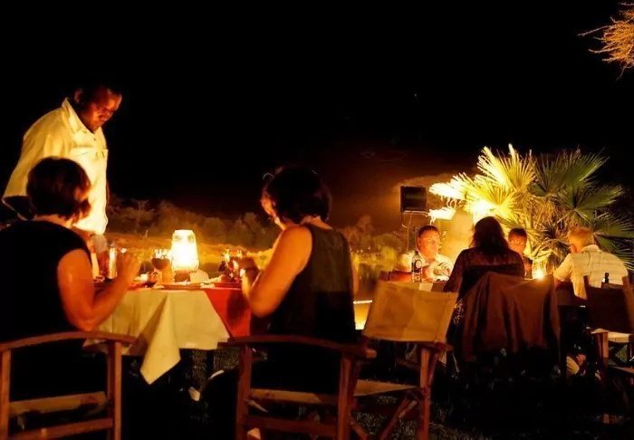 Meals are served in the main building, where you’ll also find the reception and a cosy bar. On selected evenings, there is occasionally live music in the bar. In front of the restaurant, there is a large lawn with benches and snug corners to enjoy the view of the waterhole, and midway between the restaurant and the tents, you’ll find a pool surrounded by sun loungers.