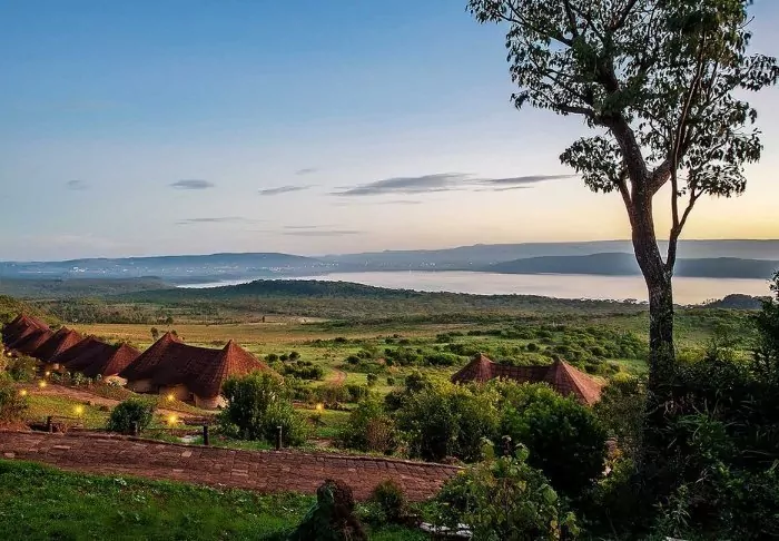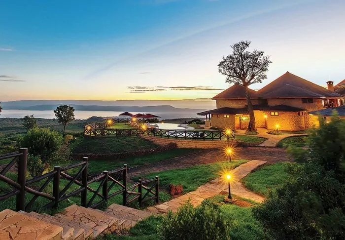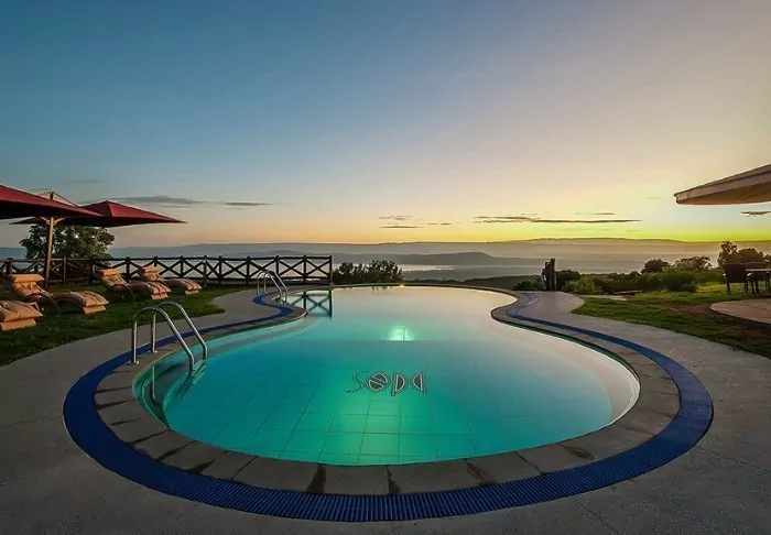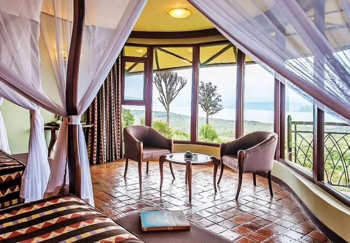 Situated on the slope of the Great Rift Valley, overlooking Lake Nakuru National Park, is the 4-star Lake Nakuru Sopa Lodge. In the evening, you can glimpse the lights of the city of Nakuru on the other side, which almost makes the darkness of the national park itself even darker. During the day, you have the most beautiful view of the lush landscape, which forms one of Kenya’s finest national parks.
