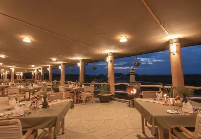 The lodge has a central thatched dining area and a bar built from natural stone. The restaurant and bar are connected to a terrace which has a direct viewpoint over the watering hole.