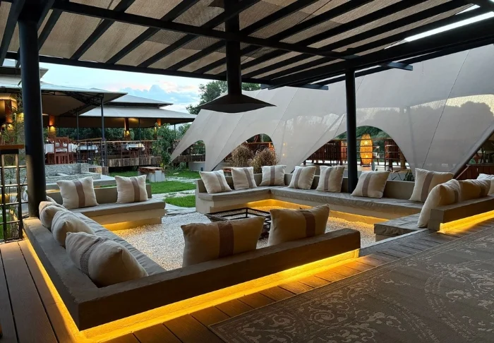 However, it might be quite challenging to tear yourself away from the warm atmosphere of the bar. Here, you’ll find plush sofas, stunning views, Wi-Fi, excellent drinks, and an utterly home-like feel. The restaurant is not far, and it is just as charmingly decorated as the rest of the camp. The food is truly exquisite – for example, you can create your own pizza, which is then baked in a stone oven.