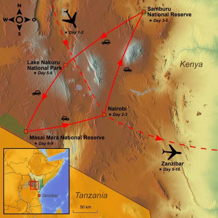 Enjoy the best of Kenya. You get up close to the nature and unique animal life in some of the country’s best national parks before digesting your experiences on white sandy beaches in Zanzibar.