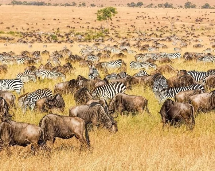 The tour heads for the amazing Masai Mara game reserve, the Kenyan part of the vast Serengeti ecosystem. During the rainy season, it’s home to arguably the largest concentration of wild animals. From July to October, you can experience the 1,200 km long migration for water and fresh grass of more than one million wildebeest along with a couple of hundred thousand zebras plus countless Thompson gazelles. It is during this migration that many gazelles fall victim to the huge Nile crocodiles when crossing the Mara River.