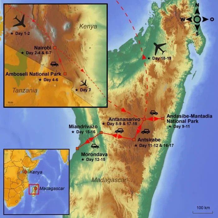 This tour will take you from Kenya’s iconic Amboseli National Park, where you’ll enjoy a safari holiday with stunning views of Kilimanjaro, to Madagascar’s enchanting rainforests teeming with extraordinary wildlife found nowhere else on earth.
