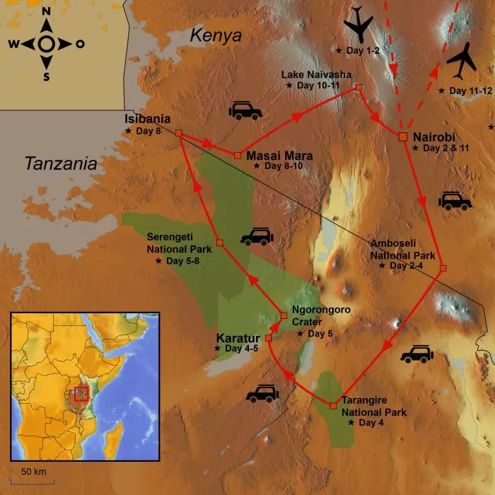 On this tour, you will visit two of the world’s best safari destinations on one and the same holiday. You travel from Kenya to Tanzania – and back to Kenya, from where you can choose to extend your tour with a beach holiday if you wish.