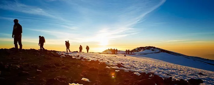 Around midnight, you will be woken up and served a snack before starting the final section of your ascent to the summit – in pitch darkness. Most people consider the difficult terrain you have to traverse on the 6-hour hike to Stella Point the biggest challenge of the entire trip. The aim is to reach Stella Point shortly after sunrise so that you can admire the sight of the blood-red sun rising gently above the horizon. You are not given long to rest, however, because otherwise it would be almost impossible to shake off the cold and fatigue and continue along the rim of the crater to Uhuru. The last stretch of the climb features an even incline. Depending on the season, you may encounter snow on the last part of the route to Uhuru Peak, which is your final goal: the top of Kilimanjaro and the highest point in Africa. Once you reach the peak at an altitude of 5,895 masl, you can give yourself a pat on the back, enjoy the magnificent view and have your picture taken in front of the Uhuru Peak sign as a lasting souvenir of your achievement.