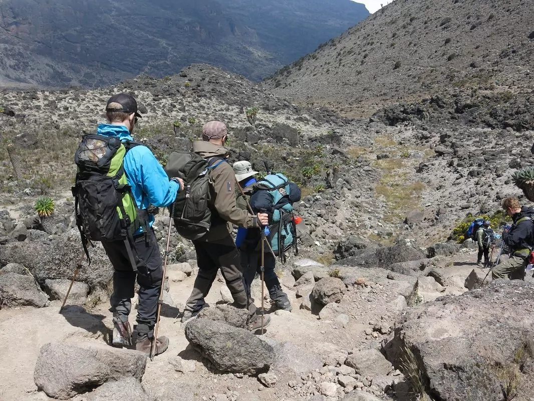 Today you will be heading east. The landscape starts to dry out, becoming more barren and stonier the higher you climb. As you continue your ascent, you can enjoy magnificent views of both Kibo and Mt. Meru, poking up above the white clouds behind you. Having followed the trail up the mountain for a couple of hours, you will reach the famous Lava Tower, which stems from Kilimanjaro’s previous incarnation as an active volcano.
